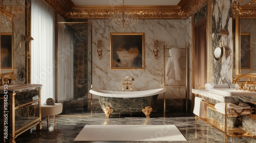 Naklejka premium Luxurious marble bathroom with gold accents, freestanding tub, and large...