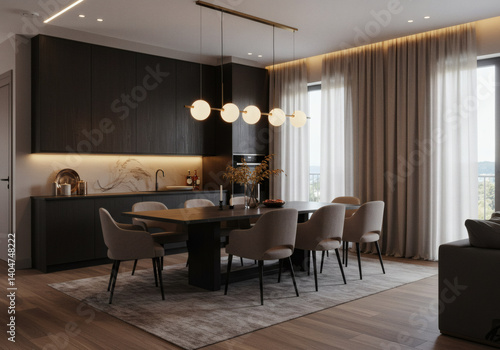 © Rifqi Zakiri, Fototapeta premium Luxurious minimalist dining room with polished stone table and warm lighting