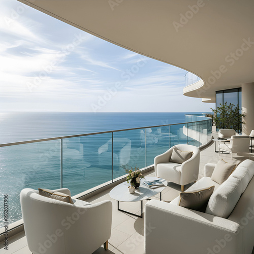 Fototapeta premium Luxurious modern balcony with comfortable white armchairs offering a serene panoramic ocean view