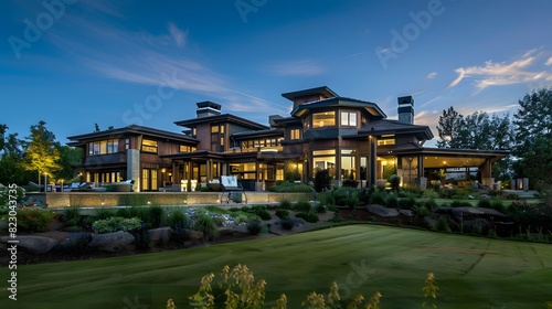 © Athena, Fototapeta premium Luxurious modern house illuminated at dusk with landscaped garden and expansive lawn.