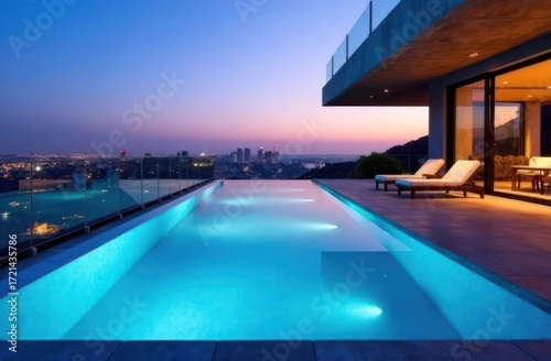 Fototapeta premium luxurious modern infinity pool overlooking city skyline at twilight. serene and elegant outdoor space. contemporary architecture, relaxation, travel inspiration. print design, website banner.