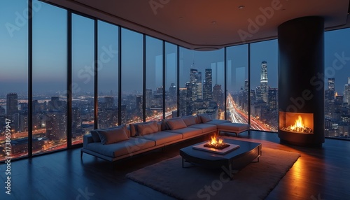 © Viktor, Obraz premium Luxurious modern penthouse living room overlooks big city at night. Skyline, skyscrapers, busy highway traffic with light streaks below wide windows. Cozy interior with comfy sofa, warm fire pit,