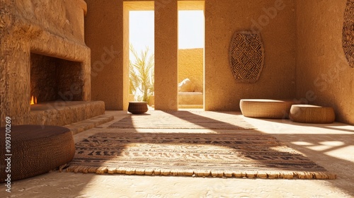 © Jakkarin, Fototapeta premium Luxurious Modern-Tribal Living Room with Stone Fireplace and Natural Textures | 3D Render Illustration