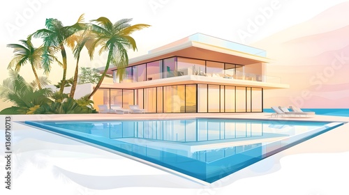 © Muhammadhamza, Fototapeta premium Luxurious Modern Villa Overlooking Ocean Sunset