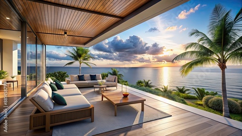 Fototapeta premium Luxurious modern villa patio overlooking the ocean in a tropical setting,...