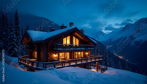 Fototapeta premium Luxurious Mountain Chalet at Night Snowy Landscape Winter Wonderland