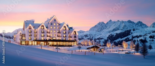 Fototapeta premium Luxurious Mountain Hotel at Sunset Snow Covered Slopes Winter Resort