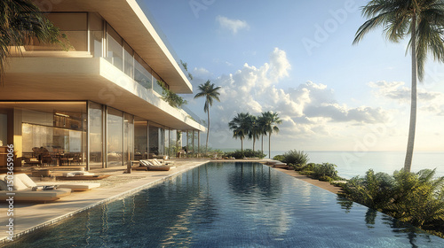 Obraz premium Luxurious oceanfront property with stunning pool and palm trees, perfect for...