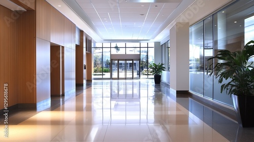 Fototapeta premium Luxurious office hallway featuring polished floors and ample natural light...