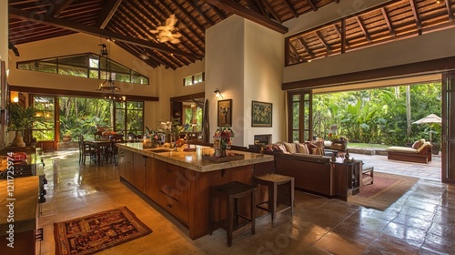 © Windi, Obraz premium Luxurious open-plan home interior with high ceilings, hardwood floors, kitchen island, and expansive views of a tropical garden.