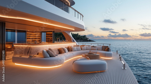 Fototapeta premium Luxurious outdoor lounge area on a yacht at sunset featuring modern seating,...