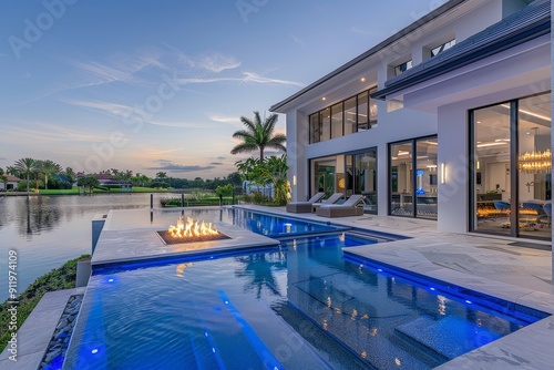 Obraz premium Luxurious outdoor pool with LED lights, raised conversation pit, water feature, and marble patio on lakefront property in Miami at sunset