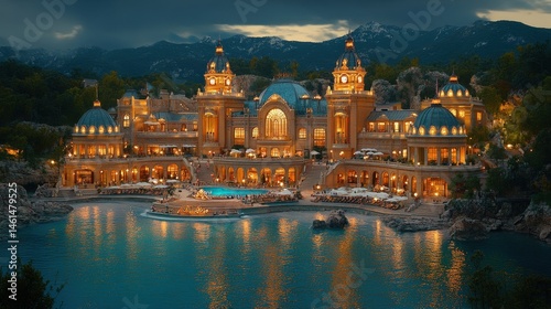Obraz premium Luxurious palace complex by a reflecting pool at twilight.
