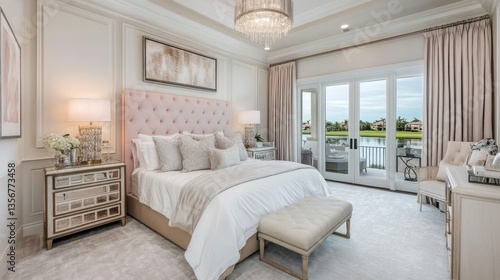 Fototapeta premium Luxurious Pink Bedroom Overlooking Waterway