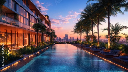 © Mario, Fototapeta premium Luxurious poolside view at sunset with city skyline backdrop.