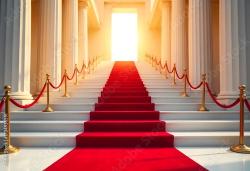 Fototapeta premium Luxurious red carpet stairs with golden ropes create a glamorous entrance for...
