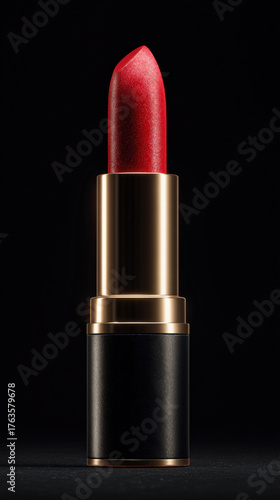 © Liffer, Obraz premium Luxurious red lipstick with sleek black and gold casing, showcasing vibrant and glossy finish. product stands out against dark background, emphasizing its elegance and allure