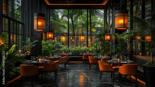 Naklejka premium Luxurious restaurant interior with tropical garden view, orange chairs, and warm lighting.
