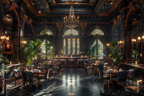 Obraz premium Luxurious richly decorated restaurant interior in dark