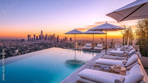 © Intach, Fototapeta premium Luxurious rooftop pool with plush sun loungers, elegant umbrellas, and breathtaking city views at sunset, creating a serene and upscale atmosphere.
