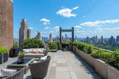 Fototapeta premium Luxurious Rooftop Terrace with Stunning Cityscape and Tranquil Greenery