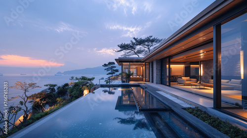 © lin, Obraz premium Luxurious Seaside Villa with Infinity Pool at Sunset