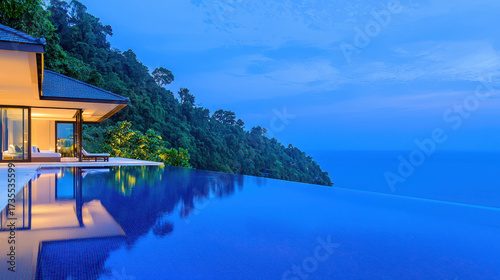 © Chineewan Somsap, Fototapeta premium Luxurious seaside villa with infinity pool overlooking ocean at twilight, surrounded by lush greenery and serene atmosphere