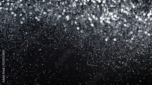 Obraz premium Luxurious Silver Glitter Cascade on Deep Black Background, Abstract Sparkling Texture for Festive Designs.