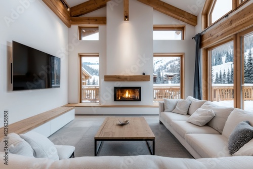 Fototapeta premium Luxurious ski lodge interior featuring a roaring fireplace plush seating and panoramic windows showcasing breathtaking snowy mountain views