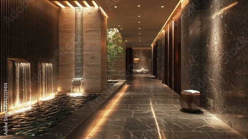 © Tuachan, Fototapeta premium Luxurious Spa Corridor with Water Features and Elegant Lighting