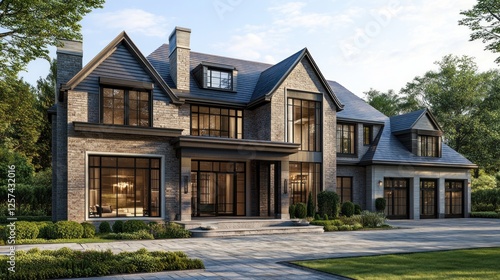 © Fenny, Obraz premium Luxurious stone house, driveway, green lawn. Architecture rendering