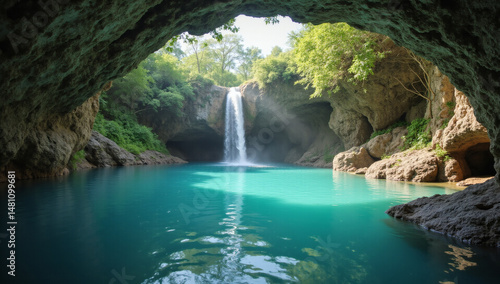 Naklejka premium Luxurious Teal Water Cave Entrance to Emerald Jungle, Stunning Nature...