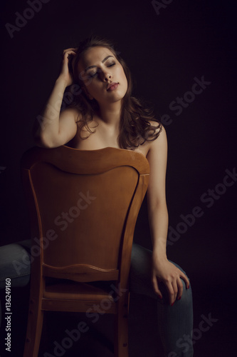 Fototapeta premium Luxurious topless woman with lush hair in the dark room