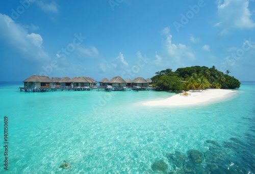 Naklejka premium Luxurious Tropical Island Resort with Crystal Clear Waters and Stunning Sunsets