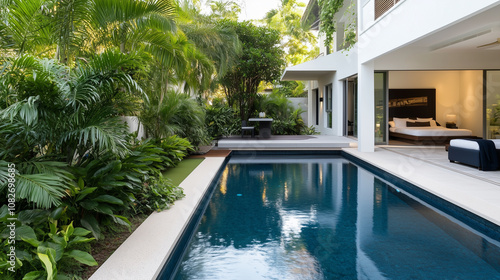 Fototapeta premium Luxurious Tropical Villa with Poolside Garden and Bedroom Access