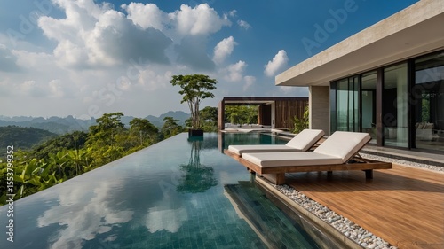 © Monty, Fototapeta premium Luxurious Villa Overlooking Lush Mountains With Infinity Pool During Bright Daytime