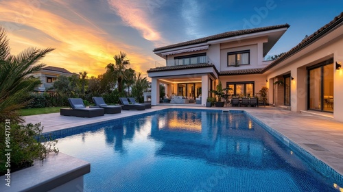 Fototapeta premium Luxurious villa with a swimming pool and spacious patio, highlighting elegant...