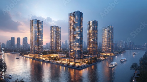 Naklejka premium Luxurious Waterfront Apartments at Dusk: A Stunning Cityscape