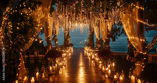 © jajuji, Naklejka premium Luxurious wedding scenes in elegant natural and architectural settings, surrounded by florals, candlelight, and evolving romantic atmospheres.