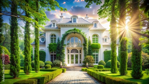 © Danicha, Fototapeta premium Luxurious White Mansion Double Exposure: Lush Greenery & Grand Entrance