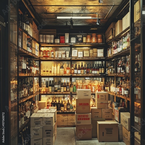 © A4719, Fototapeta premium Luxurious Wine Cellar Interior Bottles Shelves Storage