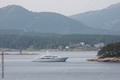© arko, Obraz premium luxurious yacht floating serenely on calm waters surrounded by pristine natural landscape
