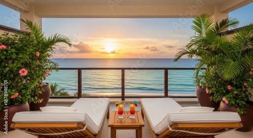 Fototapeta premium Luxury balcony offers stunning ocean vista during tropical sunset