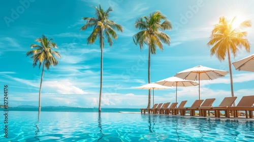 Fototapeta premium Luxury beach resort landscape with swimming pool, relaxing beach chairs and palm trees