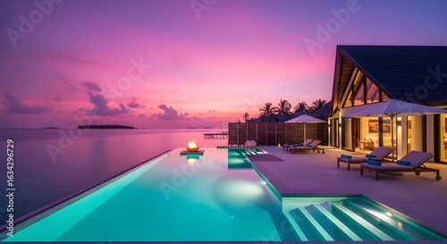 © hum lab, Fototapeta premium Luxury Beachfront Villa with Infinity Pool at Twilight | Tropical Resort Destination for Honeymoon, Vacation Rental, and High-End Travel Marketing