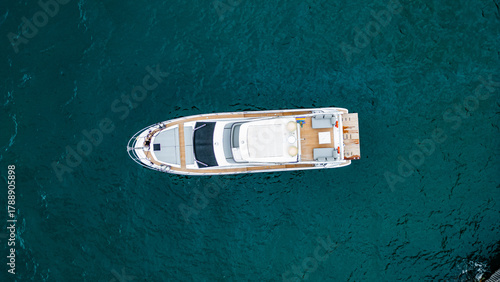 © Pedro, Fototapeta premium Luxury Boat Speedboat Yacht Tropical Paradise Beach Blue Sea Atlantic Ocean Coast Atlantic Forest Angra Dos Reis Rio De Janeiro Brazil South America Idyllic Heavenly Summer Colorful Saturated Green