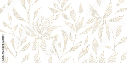 Naklejka premium Luxury botanical vector background with golden palm leaves, floral line art, elegant tropical pattern, modern Art Deco design. Summer wallpaper, spa card, wedding template.