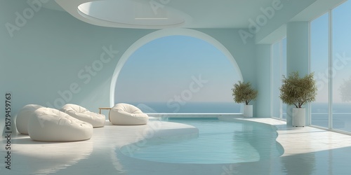 © Orod, Fototapeta premium Luxury building poolside lounge with white beanbag chairs, curved architecture, ocean view, blue and white tones