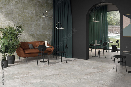 Obraz premium Luxury cafe interior with grey marble floor an walls, brown sofa in waiting...