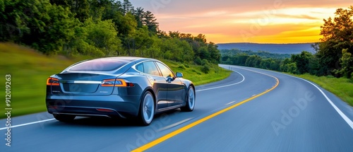 © diowcnx, Fototapeta premium Luxury Car Driving On Winding Road At Sunset